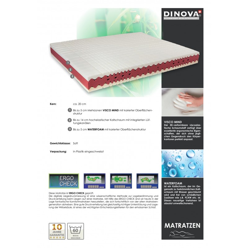 Eigenschaften: Die ergonomische Gestaltung der Oberfläche mit den integrierten Liegezonen passt sich ausgezeichnet an die Körperform und dem Gewicht an. Beste Punkt- und Biegeelastizität. Dank der Oberschicht aus VISCO MIND und den zwei Schichten aus FCKW-freiem WATERFOAM garantiert diese Matratze eine ausgezeichnete Stützung der Wirbelsäule. Durch die spezielle Noppenstruktur der Unter- und Oberschicht wird zusätzlich die Durchblutung der Blutgefässe mobilisiert. Diese sehr Softe Matratze wurde speziell für Menschen, die kuschelig und weich liegen möchten, entwickelt.