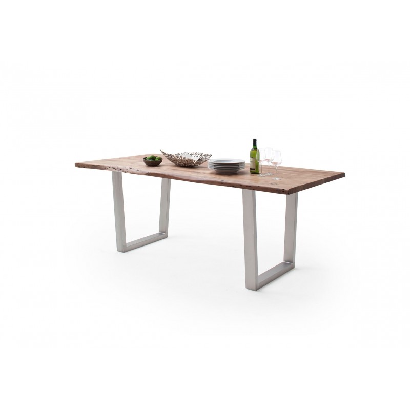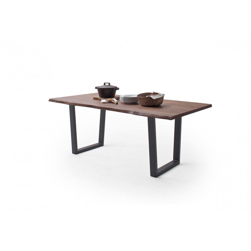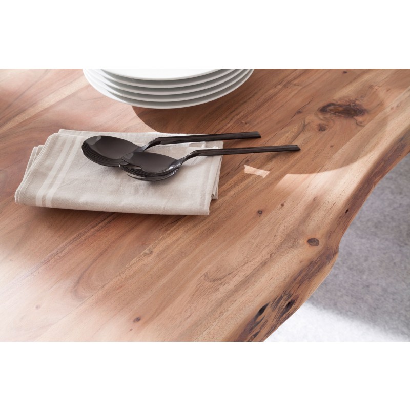 Der extravagante rustikale Calabria Design Esstisch aus Akazie und Metall bringt Leben und Freude in Ihr Esszimmer und passt sowohl in einen modernen als auch in einen rustikal eingerichteten Essbereich. Die Unikat Tischplatte aus massiver Akazie ist ein echtes Naturprodukt und somit einzigartig in Struktur und Farbe. Äste, Verwachsungen und die Baumkante sind gewollt.