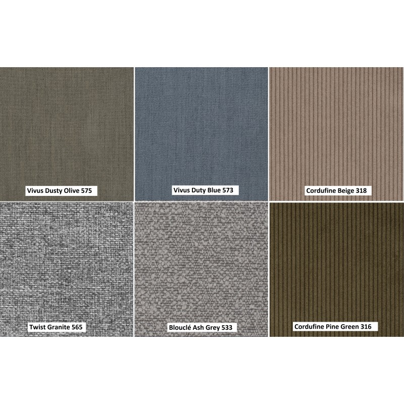 Standard Bezugsfarben: Corduroy Pine Green + Beige, Twist Granite, Vivus Dusty Blue + Olive, Bouclé Ash Grey
