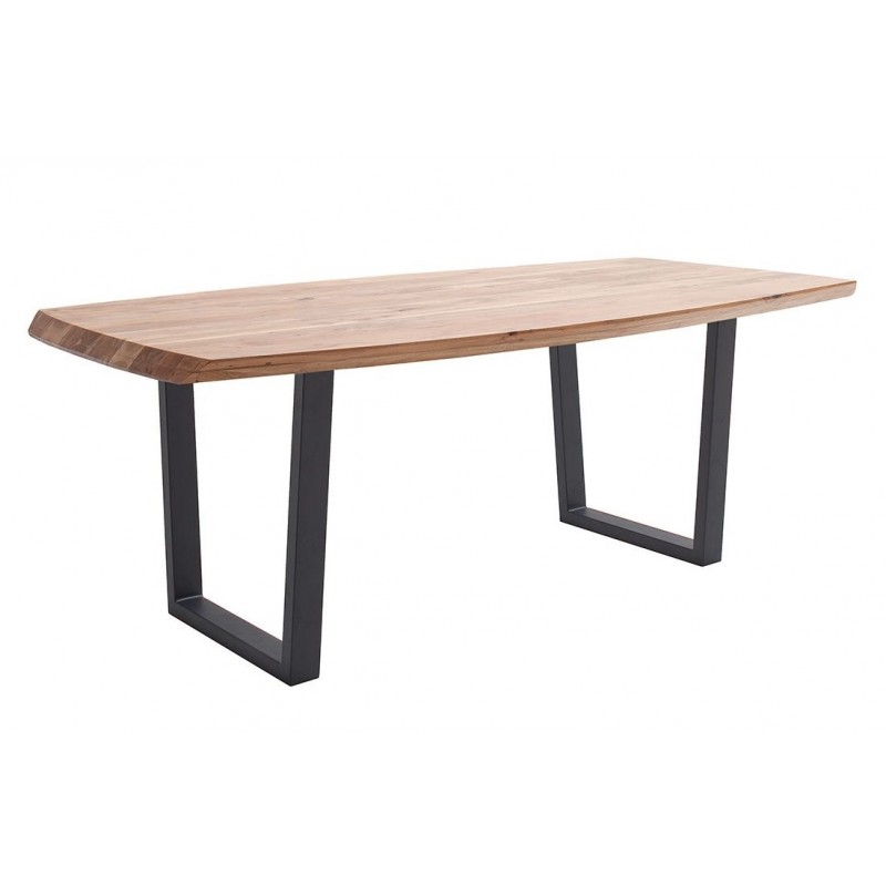 Der extravagante Design Esstisch aus Akazie und Metall bringt mit seinem schwung, Leben und Freude in Ihr Esszimmer und passt sowohl in einen modernen als auch in einen rustikal eingerichteten Essbereich. Die Unikat Tischplatte aus massiver Akazie ist ein echtes Naturprodukt und somit einzigartig in Struktur und Farbe. Äste, Verwachsungen und die spezielle Kante sind ein Highlight.